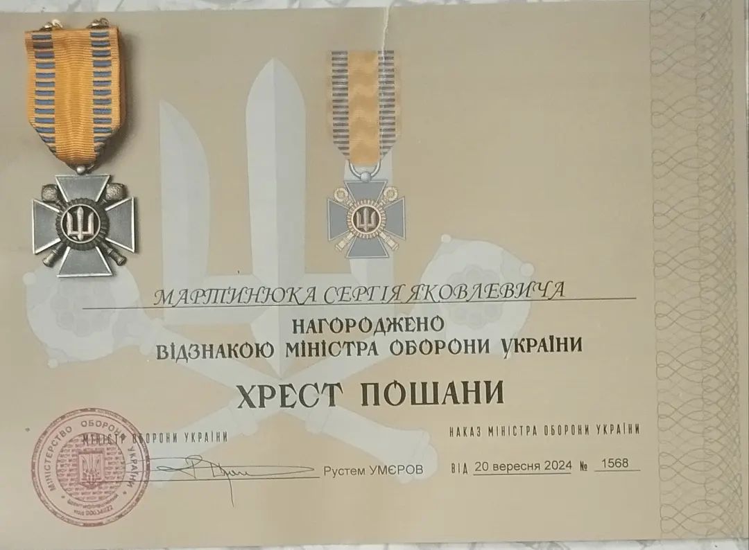 6 жовтня 2024 року Начальник Національного університету оборони України, генерал-полковник Коваль Михайло Володимирович вручив відзнаку Міністра оборони України «Хрест пошани» викладачу кафедри військових дисциплін Київського військового ліцею імені Івана Богуна Мартинюку Сергію Яковичу. Відзнакою – медаль «Хрест Пошани» – нагороджуються військовослужбовці та працівники Збройних Сил України, а також інші особи за значний особистий внесок у справу розбудови, розвитку та забезпечення життєдіяльності Збройних Сил України, досягнення високих показників у військовій, науковій, освітянській та інших сферах.