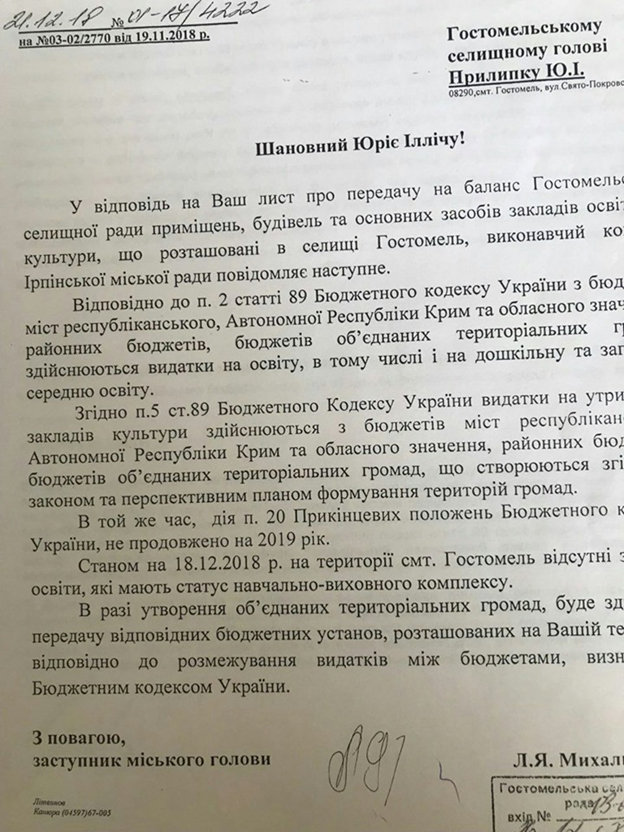 Ось бачимо одне зі звернень та відповідь на нього. Ці звернення зумовлені тим, що Ірпінська влада відверто ігнорували питання утримання цих бюджетних установ.