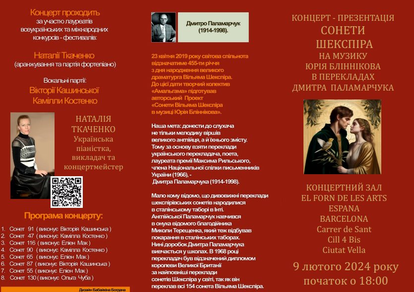 Наш концерт присвячений одразу трьом ювілеям, бо саме в 2024 році виповнюється: 460 років з дня народження Вільяма Шекспіра, 110 років з дня народження Дмитра Паламарчука та 75 років – Юрія Бліннікова. Сподіваємося, що ми зможемо познайомити міжнародну спільноту як зі школою українського перекладу та музики, так і з українською культурою загалом, яка завжди була відкритою для всього світу.