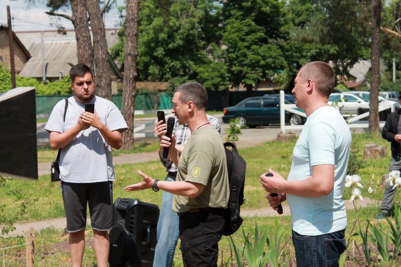 У своєму виступі Ігор Домбровський розповів історію цього скверу, який відстояла Громада від забудови. Непримиренна позиція представників громадськості цього мікрорайону та кілька парканопадів унеможливили будівництво на цій ділянці. Замість спиляних забудовниками сосон люди посадили й вирощують нові дерева.